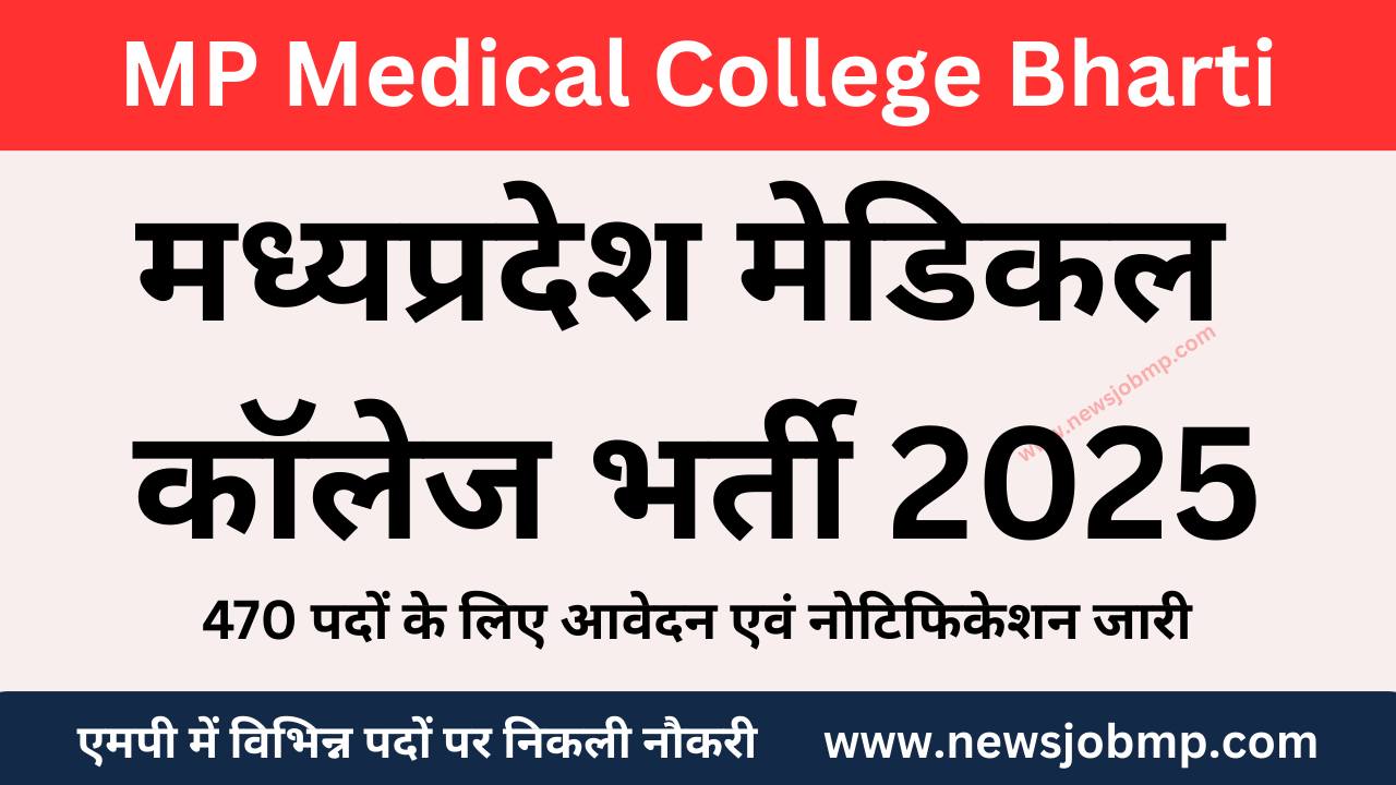 MP Medical College Bharti 2025:मध्यप्रदेश मेडिकल कॉलेज भर्ती प्रक्रिया के अंतर्गत सरकारी मेडिकल कॉलेजों में प्राध्यापक,सह प्राध्यापक और सहायक प्राध्यापक के 470 पदों पर आवेदन आमंत्रित किए हैं।इन पदों पर आवेदन की अंतिम तिथि 6 मई 2025 तक है|